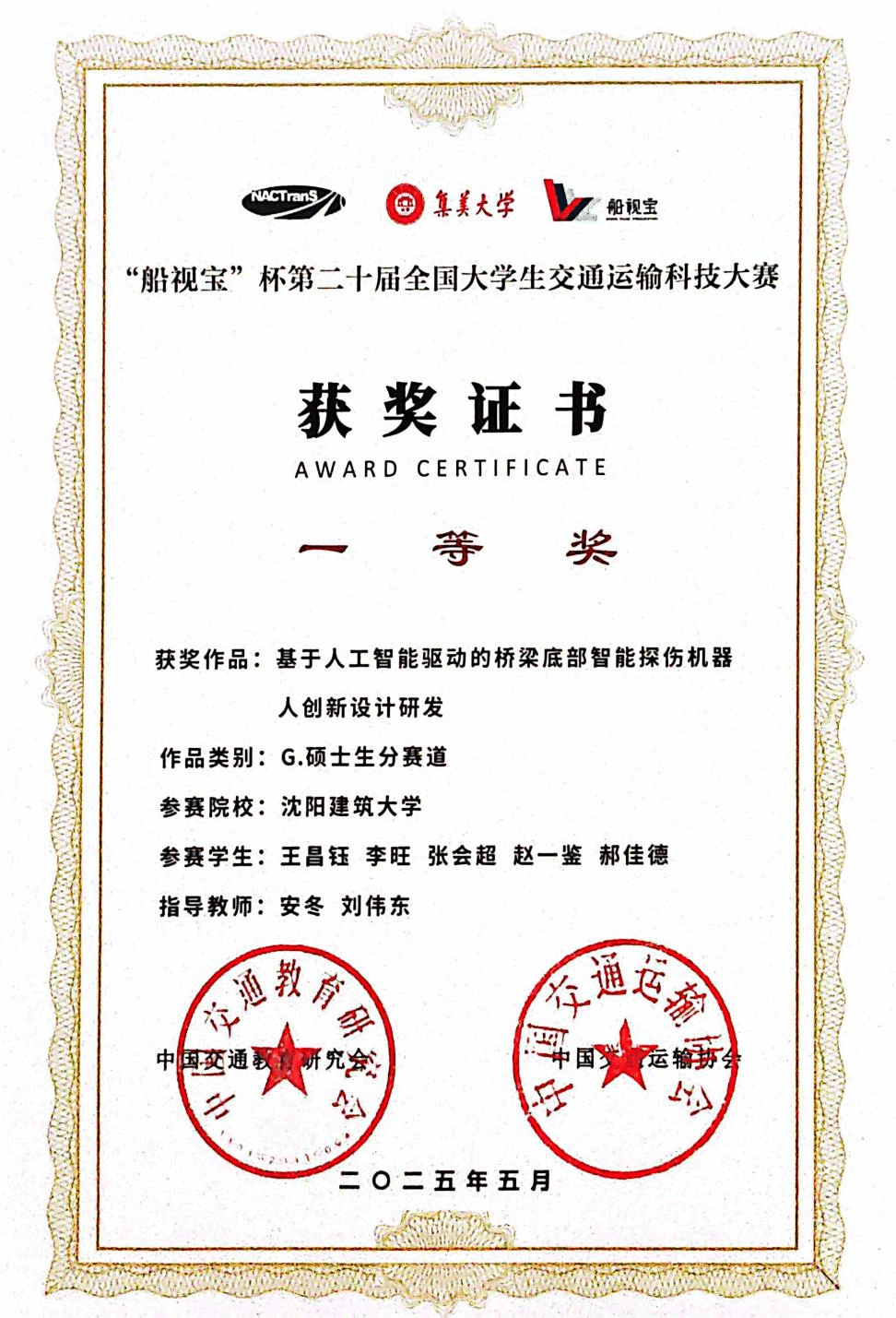 第二十届全国老员工交通运输科技大赛决赛于5月23—25日在集美大学成功落幕。由DB旗舰安冬教授担任指导老师,研究生王昌钰、李旺、张会超、赵一鉴、郝佳德组成的参赛团队表现优异,成功斩获全国一等奖。