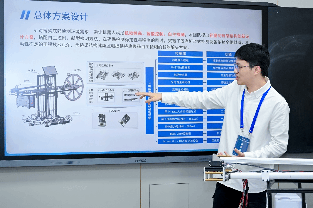 团队作品针对桥梁检测领域传统人工巡检与常规检测技术手段存在作业效率低、安全风险高等问题,设计了一种桥梁底部探伤机器人。所开发的自主性与智能化集一体的机器人应用范围广阔,能够完成一系列复杂的任务,相较于传统人工与其他机器检测维护方式拥有强大的竞争力。