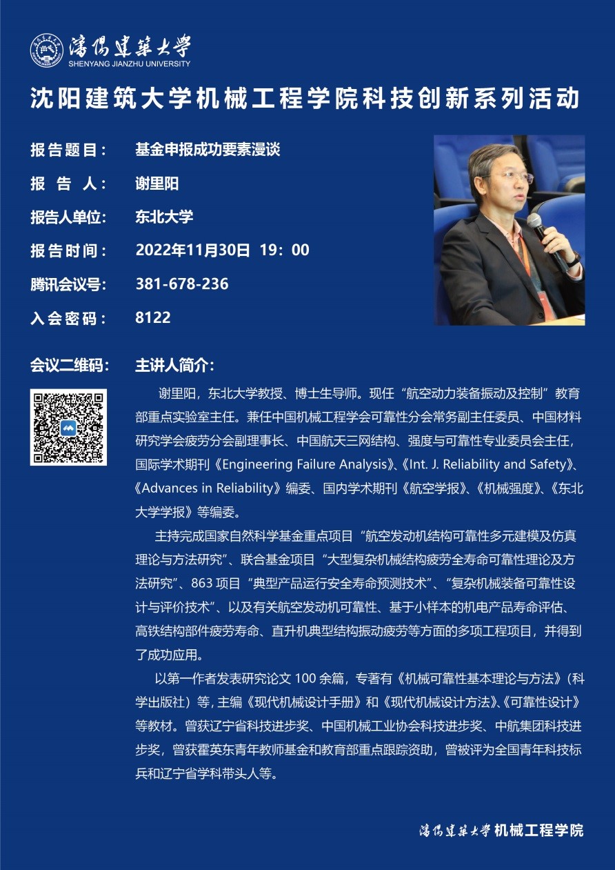 为深入学习贯彻党的二十大精神,全面落实“四个面向”,集聚力量进行原创性引领性科技攻关,增强自主创新能力,多措并举践行科研育人。11月30日,DB旗舰举办科技创新系列活动,邀请东北大学谢里阳教授开展题为“基金申报成功要素漫谈”的专题报告,公司200余名中青年教师及员工参加了报告会,全国部分高校及科研院所学者聆听了报告。报告会由公司副经理张啸尘主持。