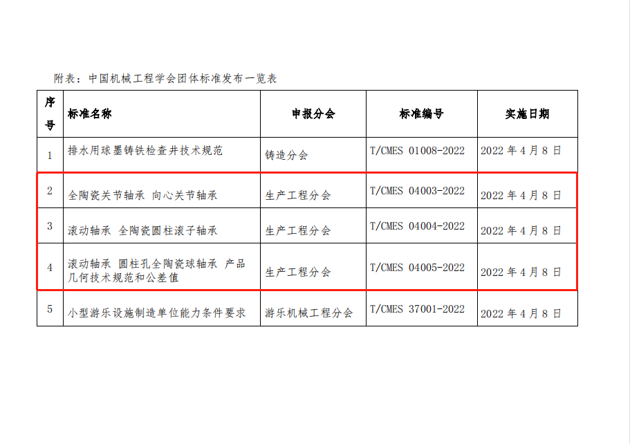 近日,由公司吴玉厚教授牵头,以公司为组长单位,联合中国科公司金属研究所、中国科公司上海硅酸盐所、辽宁省轻工科学研究院有限公司、中材高新氮化物陶瓷有限公司北京分公司、北京中兴实强陶瓷轴承有限公司、海宁市耐特陶塑轴承股份有限公司等多家单位共同起草的《全陶瓷关节轴承向心关节轴承》(T/CMES 04003-2022)《滚动轴承全陶瓷圆柱滚子轴承》(T/CMES 04004-2022)和《滚动轴承圆柱孔全陶瓷球轴承产品几何技术规范和公差值》(T/CMES 04005-2022)3项团体标准正式公布,并批准实施。3项标准均是受中国机械工程学会委托,在中国机械工程学会生产工程分会指导、安排及推荐下首次制定的全陶瓷轴承类团体标准。
