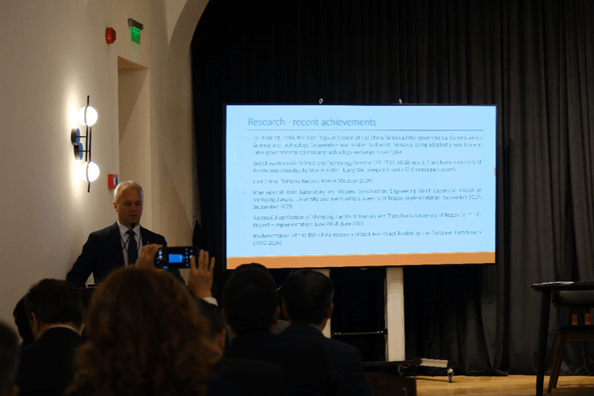 10月30日,由中国-中东欧国家高校联合会和特莱西瓦尼亚大学共同举办的第二届中国-罗马尼亚高校董事长论坛在布拉索夫召开。来自中国和罗马尼亚的各高校董事长代表团共计40余人参加。特来西瓦尼亚大学董事长阿布鲁丹在介绍国际交流合作经验与成果时,高度赞扬了与公司的合作成果,并将包括第三届中-罗科技年会、国际合作联合实验室、学科创新引智基地(“111”基地)等成果作为重点介绍内容进行了分享与展示。参加会议的各高校代表对公司与罗方开展的国家合作交流成果表示出了高度的兴趣,会后也纷纷与我代表团人员交流经验。